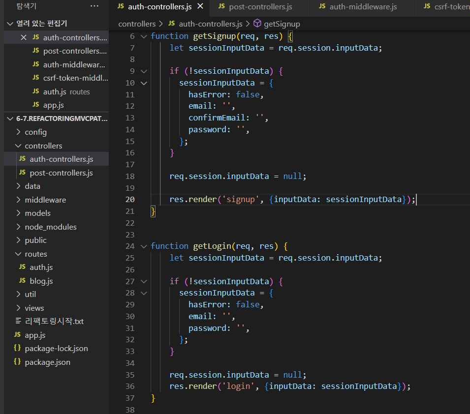 그런데, 만들어 놓은 controller 2개 중, 한쪽의 controller에만 이게 적용되고 나머지 하나는, render할때마다 csrf 토큰 에러가 발생한다.