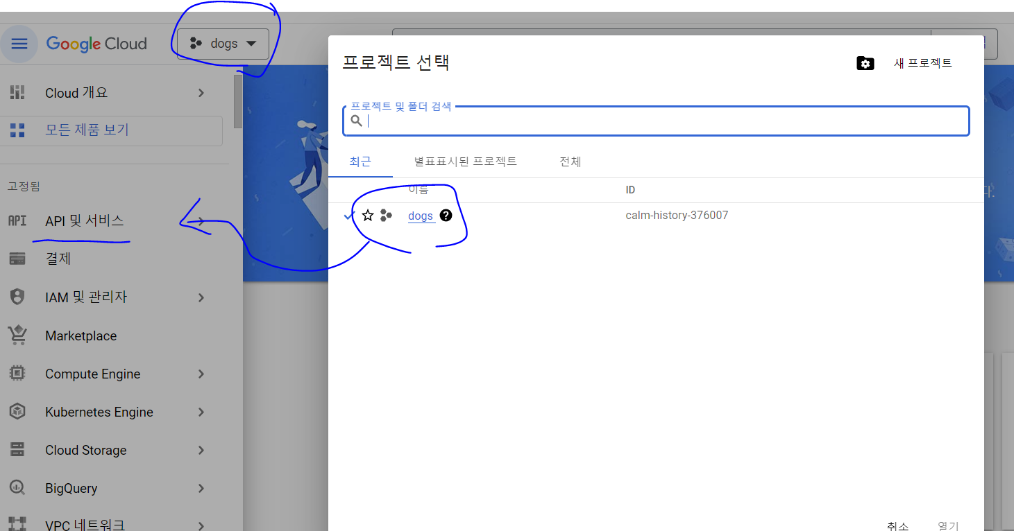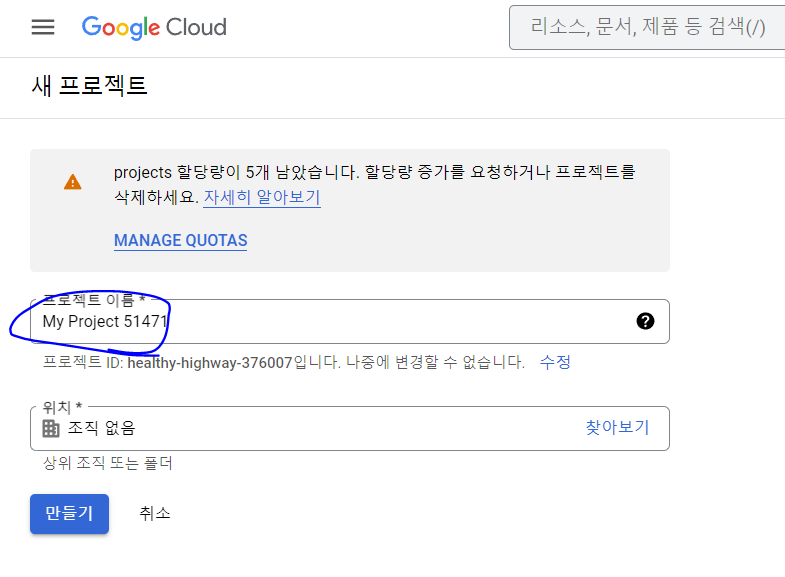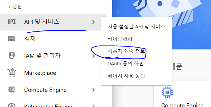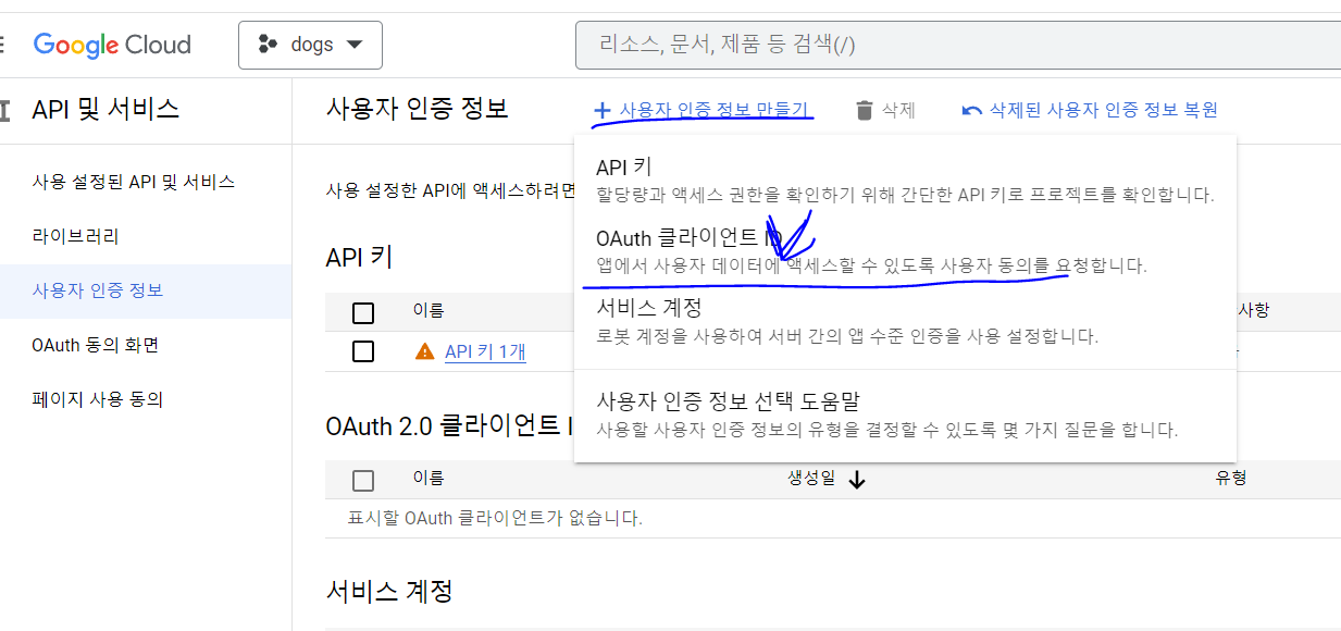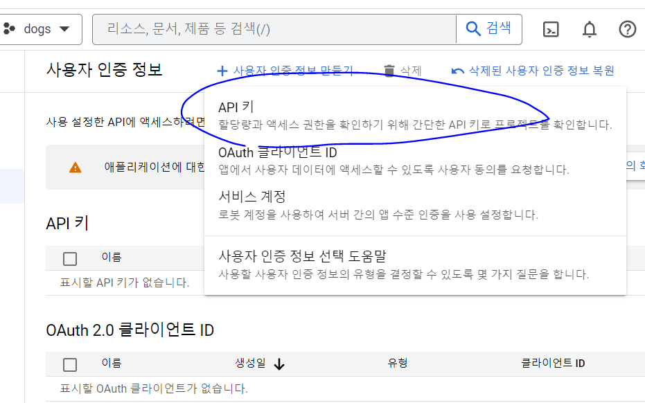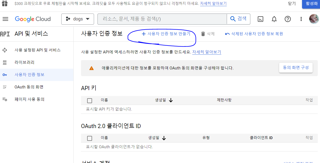 구글 디벨로퍼 API 서비스에 들어가서, 프로젝트를 만든다.