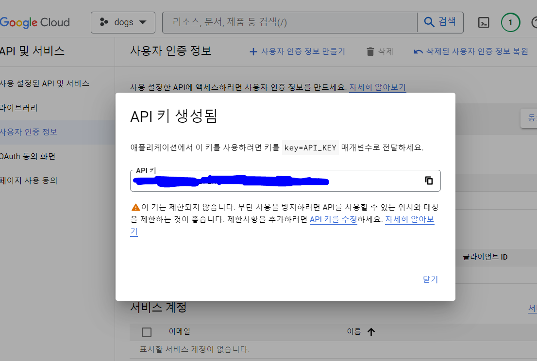 9. 사용자 인증 정보 탭에 들어가, API 키를 만든다.