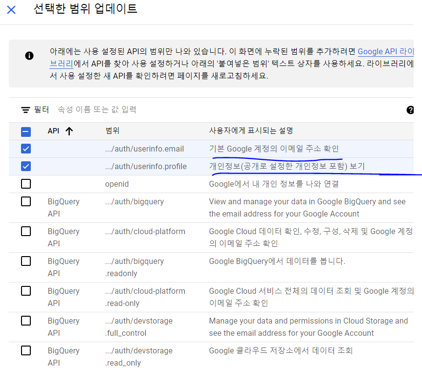 사용자에 대한 기본 정보만 필요하므로, 필요한 두개만 체크해보았다.
