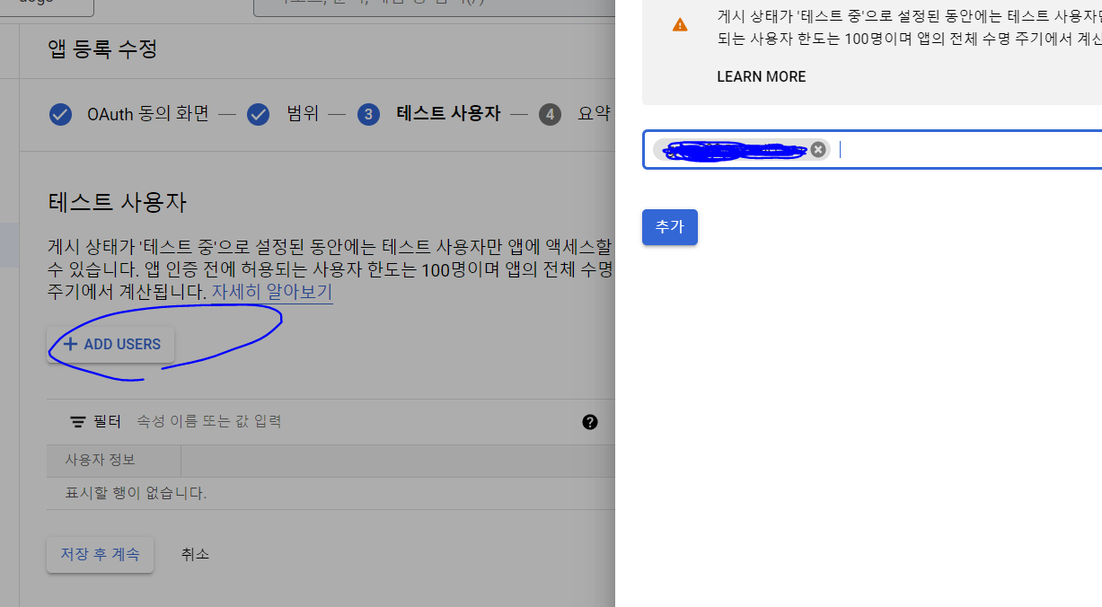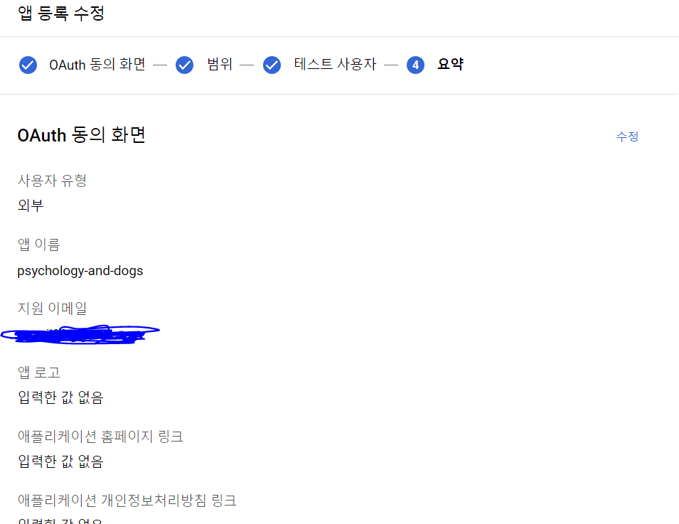 13. 마지막으로 테스트 사용자만 지정해두면 화면 구성은 끝난다.