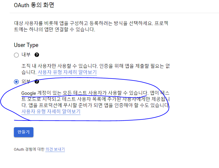 우리는 모든 구글 계정 사용자가 이용 가능해야 하므로, "User Type" 을 [ 외부 ]로 지정한다.