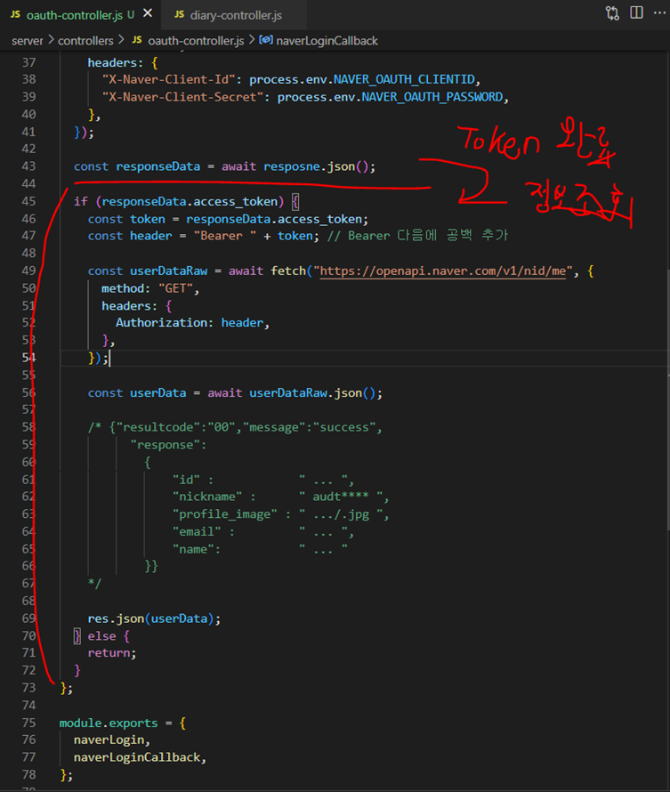 컨트롤러에 받아온 토큰으로 값을 받는 코드를 작성 하자.