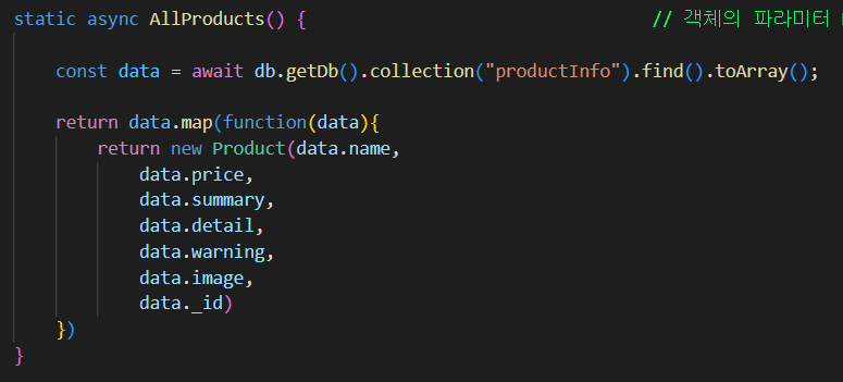 배열의 첫번째 객체에 관하여, Product 객체의 constructor에 전부 들어가서 한 값으로,