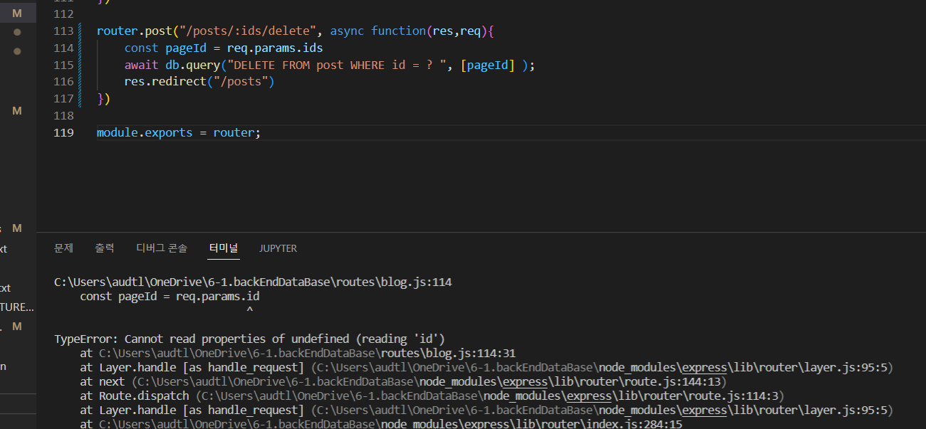 이게 웬걸 삭제버튼만 req.params.id를 읽을수가 없단다.
