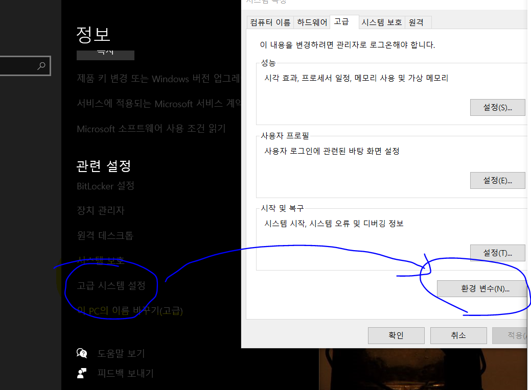 1. [내컴퓨터 - 우클릭 - 속성 ] 진입하면 [ 고급 시스템설정] 이 나온다