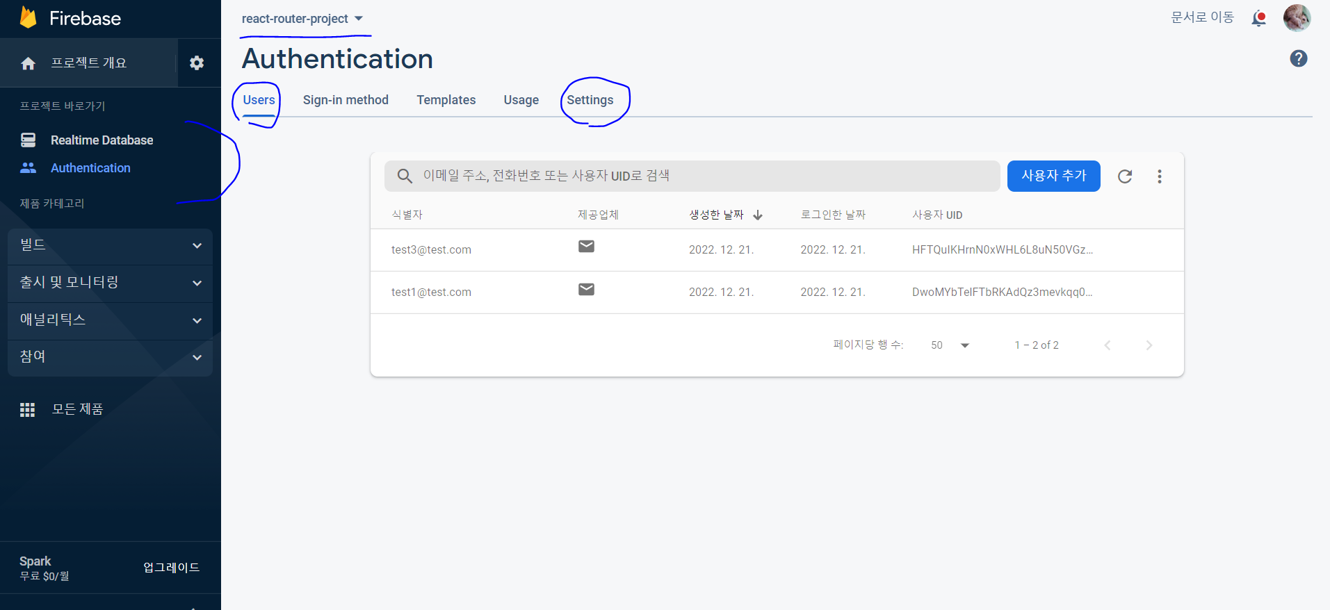 파이어베이스의 Project 안쪽, Authentication 탭에는,